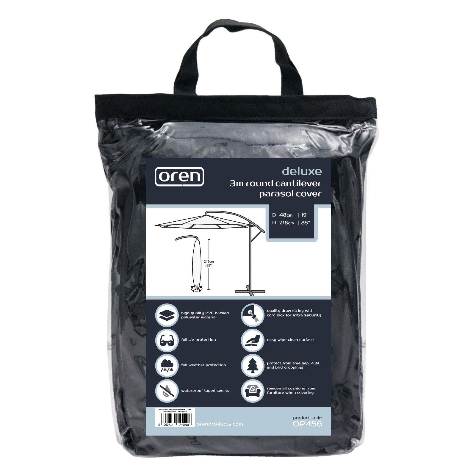This Deluxe Round Cantilever Parasol Cover fits parasols up to 300cm and offers full protection. The cover is made from strong, durable water-resistant PVC Backed Polyester. The material has been U.V tested for further protection and features an easy wipe surface, protecting you from all-weather types, dirt or bird droppings. It features rust resistant brass eyelets and heavy duty security ties for secure fitting.