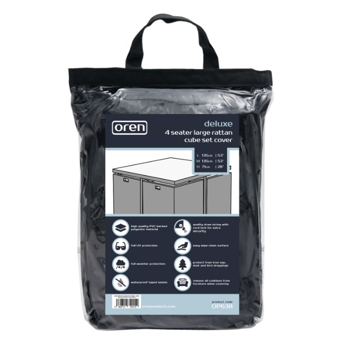 The Deluxe 4 Seater Rattan Cube Set Cover Large offers you full protection for your garden furniture. The cover is made from strong, durable water-resistant PVC backed polyester. The material has been U.V tested for further protection and features an easy wipe surface, protecting you from all-weather types, dirt or bird droppings. It features rust-resistant brass eyelets and heavy duty security ties for secure fitting.