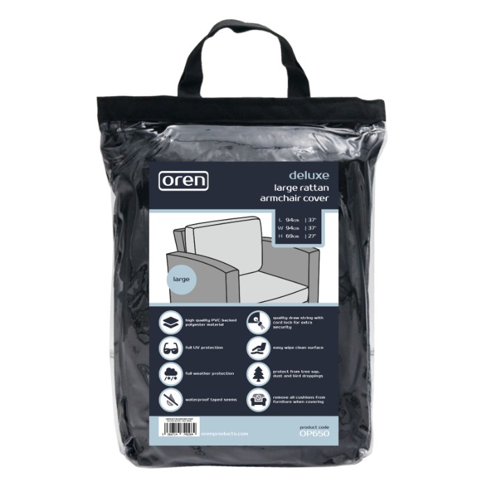 The Deluxe Large Armchair Cover offers you full protection for your garden furniture. The cover is made from strong, durable water-resistant PVC backed polyester. The material has been U.V tested for further protection and features an easy wipe surface, protecting you from all-weather types, dirt or bird droppings. It features rust-resistant brass eyelets and heavy duty security ties for secure fitting.