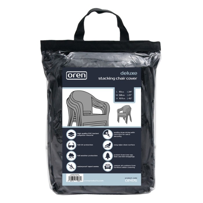 The Deluxe Stacking Chair Cover offers you full protection for your garden furniture. The cover is made from strong, durable water-resistant PVC Backed Polyester. The material has been U.V tested for further protection and features an easy wipe surface, protecting you from all-weather types, dirt or bird droppings. It features rust resistant brass eyelets and heavy duty security ties for secure fitting.