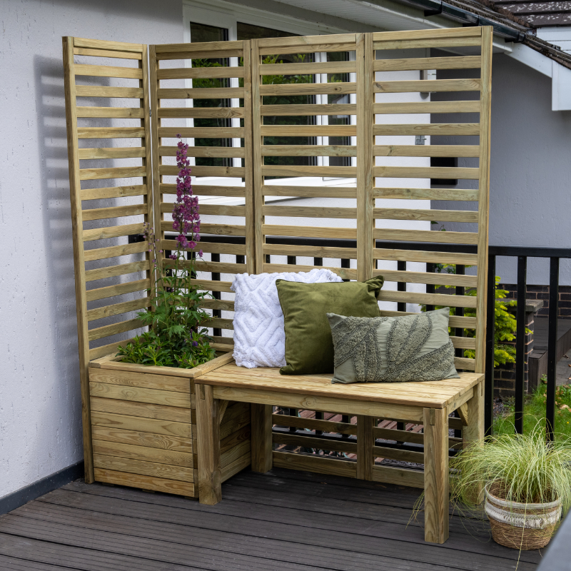 The Hartwood Modular Garden Seating With Trellis – Option 1 is ideal for a smaller garden or as a modern alternative to an arbour. This garden seating set includes 4 upright trellis panels, 1 bench, and 1 square planter. The Modular Garden Seating range provides you with the flexibility to design a seating area which suits your purpose and your space.