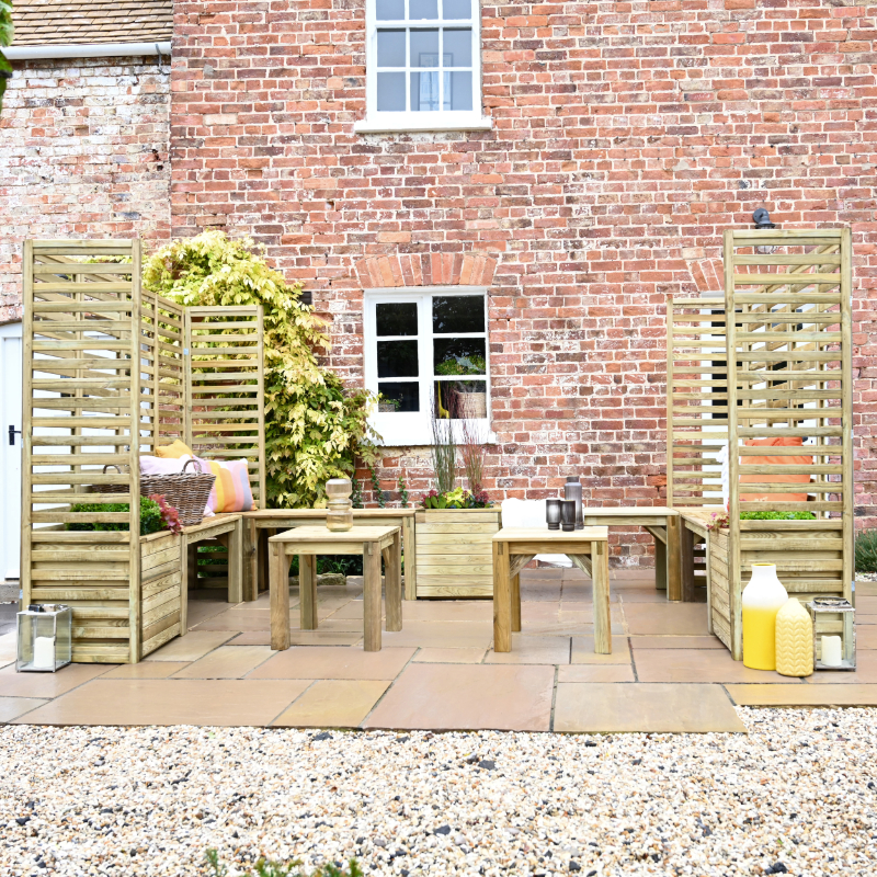 The Hartwood Modular Garden Seating With Trellis – Option 5 provides all the elements you need to create an impressive, bespoke garden seating area for entertaining and relaxing. The Modular Garden Seating range provides you with the flexibility to design a seating area which suits your purpose and your space. The V5 garden seating set includes 12 upright trellis panels, 4 benches, 4 square seats/tables, and 3 square planters.