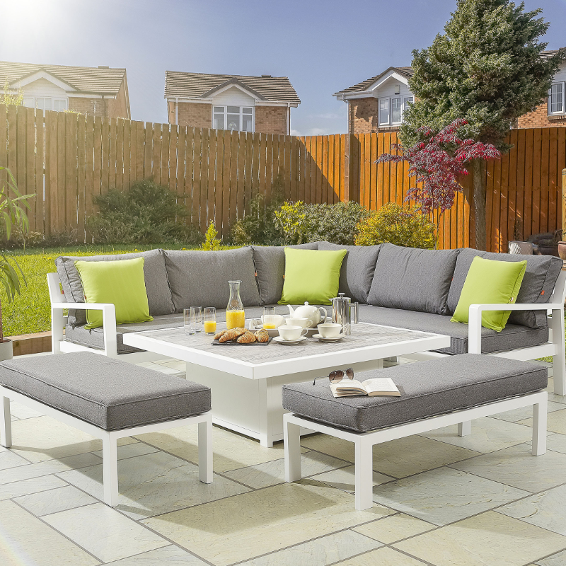 Combining comfort with practicality, this contemporary lounge and dining set is a versatile addition to any outdoor space. Comprising of a large five-seater corner sofa and two, two-seater benches, there’s plenty of room to either lounge out and relax or to entertain friends and family. The large square table has two handy height adjustable settings, enabling it to be used as both a convenient low-level coffee table and a usable dining table. Why Choose Hex Living? All products come with a lifetime warranty (metal components only). Delivery direct to your door within five working days. Our products are rust and maintenance-free;* made using premium quality, heavy duty metal. Customer service team at the end of the phone to provide support when needed. All metal components are made in Britain, supporting British manufacturing. Made In The Heart Of Staffordshire HEX Living are proud to be a British manufacturer and take immense pride in the work we do supporting our nation’s economy, creating jobs and reinforcing our country as a place of world-class design and engineering. Our state of the art production facility is located just a few miles outside of Stafford and serves as a testament to our innovation and manufacturing expertise, confirming our heritage as a leading Midlands manufacturer. Offering a more sustainable alternative to foreign imports, our standing as a UK based manufacturer also ensures that our products have a significantly lower carbon footprint than those produced abroad, furthering our commitment to a greener, carbon neutral future. Quality Assured For Life All HEX Living products have been designed and built to last which is why we offer a lifetime warranty on all metalwork components across our entire range of products. Our warranty reflects the premium materials we use, engineered with high levels of precision to assure the durability and performance of your HEX Living product. Every product in the HEX Living range is rigorously tested against all relevant British Standards, that said, our ethos at HEX Living is all about designing and manufacturing products that far exceed standards. Once you’ve purchased your HEX Living product, you’ll need to register it by completing the form on hexliving.co.uk. This will activate your lifetime warranty.