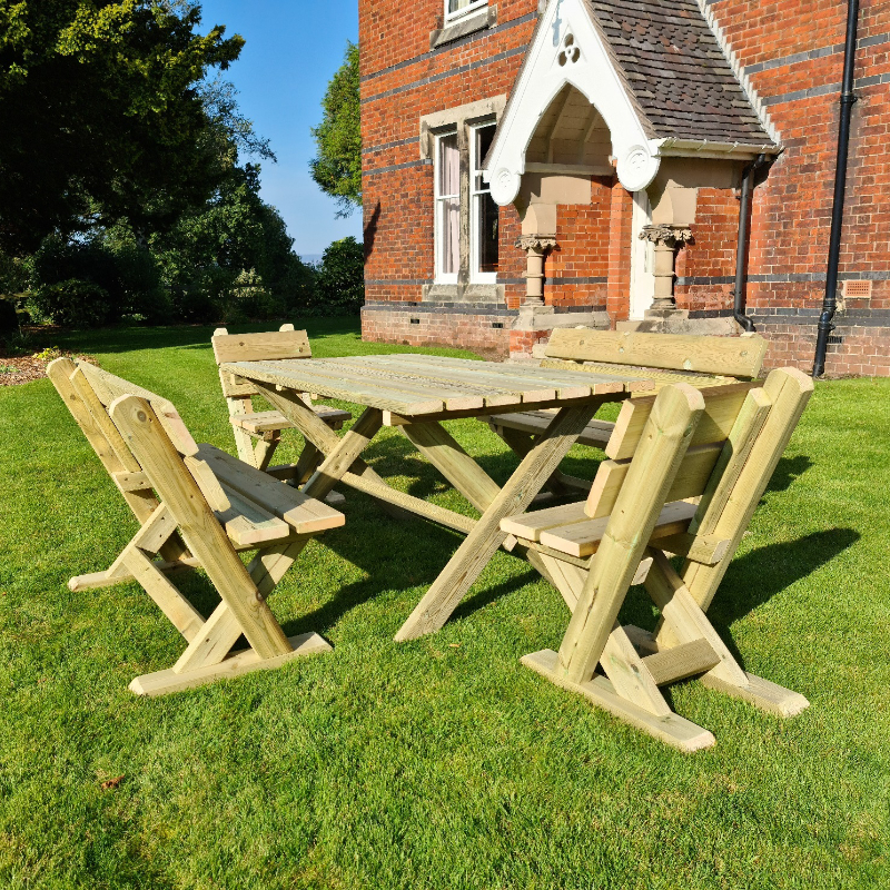 The Moorvalley 6 Seater Cheddleton Dining Set is made to withstand all weathers and built to last. A simple design to complement all gardens and outdoor spaces. Dimensions Table: L-120cm W-93cm H-77cm Bench: H-90cm W-120cm D-65cm Chairs: H-90cm W-49cm D-65cm