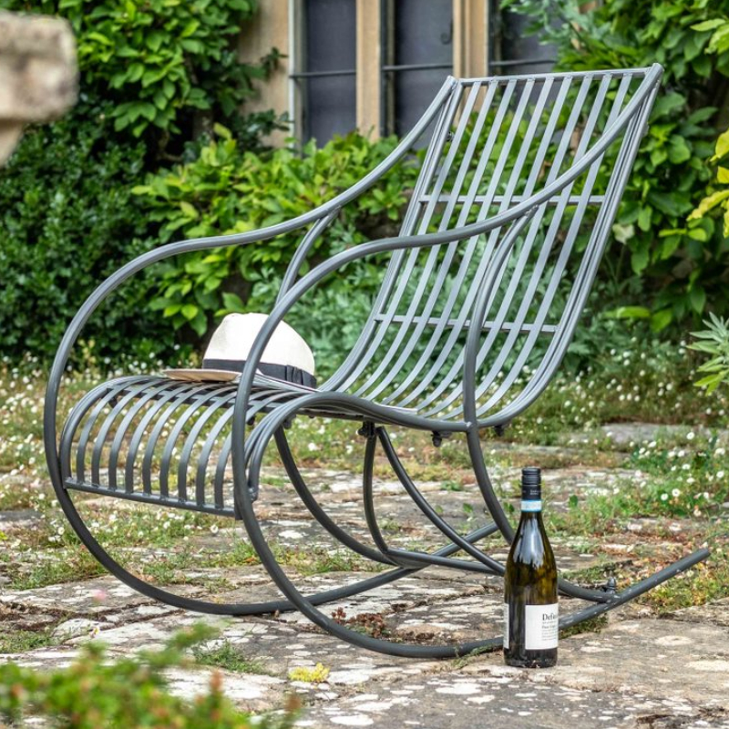 The Osbourne Dickinson Metal Garden Rocking Chair is shaped using deep curves to create a comfortable and relined position. The arm rests provide a more comfortable upright sitting position, or extra support when reclined while still allowing free movement thanks to the open sides.