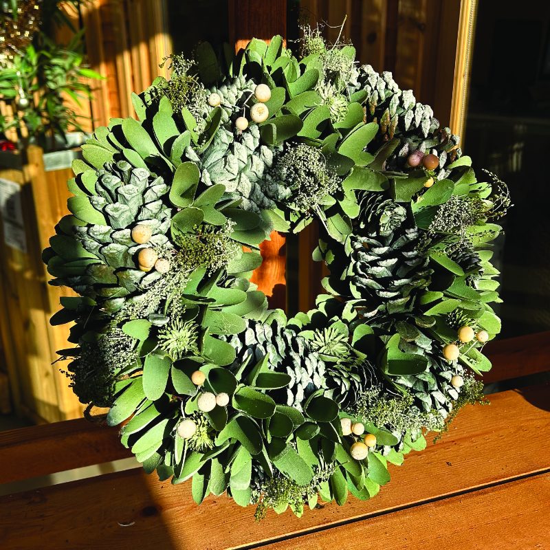 This beautiful mistletoe wreath has been made from natural wood shavings and white berries all hand crafted onto a foam base for easy installation. Its traditional, classic design will bring festive cheer and warmth to any home, while its easy installation makes it a perfect way to add the holiday spirit.