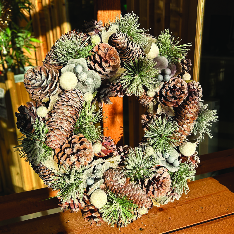 This classic wreath is decorated with textured pinecones, lush fir branches, and white berries, all gracefully dusted with frost to give a delightful wintery vibe. An elegant holiday accent for your entryway, fireplace, or any area that requires a hint of seasonal style.