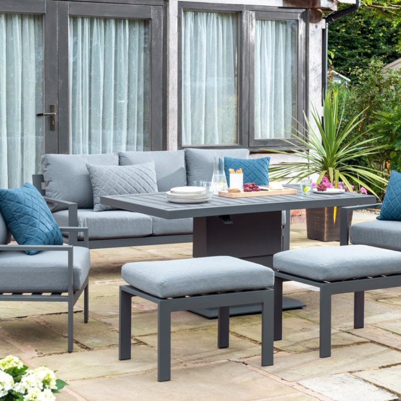 The Pheasant 5-7 Seater Aluminium Lounge Set comes with a 3 seater sofa, 2 chairs, 2 stools and a height adjustable coffee table offering flexibility in seating and dining arrangements, with the deep seat cushions and angled back rests creating a comfortable feel and position. Made with Quality Acrylic/Polyester deep seats and a supportive shower resistant plastic coating.