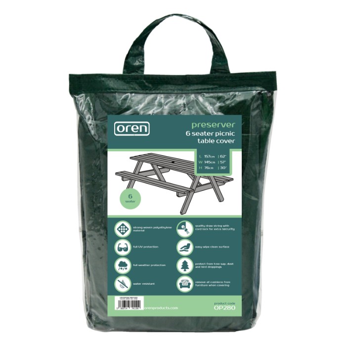 The Preserver 6 Seater Picnic Table Cover offers you full protection for your garden furniture. The cover is made from strong, durable water-resistant material. The material has been U.V tested for further protection and features an easy wipe surface, protecting you from all-weather types, dirt or bird droppings.