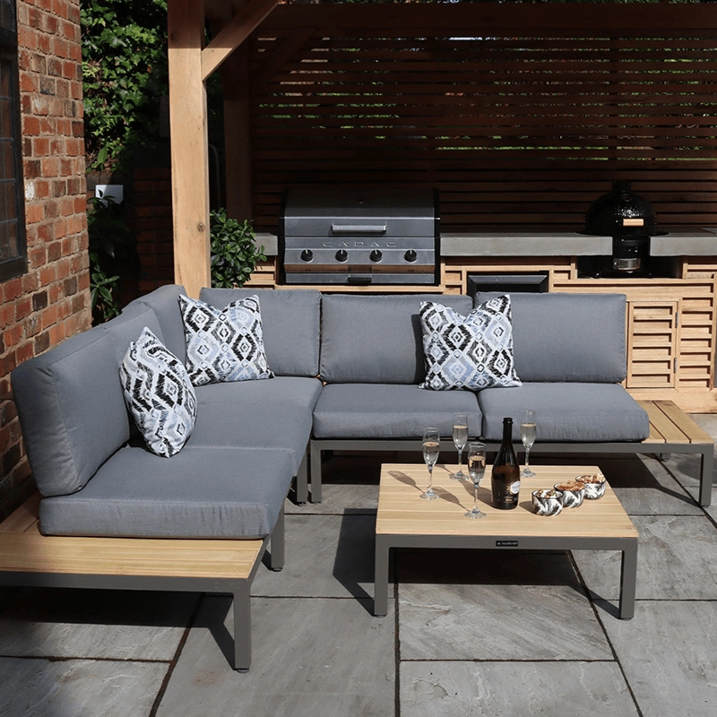 The RC Aspen 4 Seater Aluminium And Wood Modular Corner Lounging Sofa Set is a modern and contemporary style with its aluminium framework construction and high-grade FSC certified 100% teak, this set offers style, comfort, strength, fashion and durability. Complete with a coffee table and weather shield seat cushions, it is perfect for lounging in style with family and friends. This Lounging Set offers the contemporary rope effect look but uses synthetic rattan weave for quality long-lasting furniture. This range is perfect if you have a contemporary style of garden as it is very modern and stylish. Featuring a corner lounging set and a sofa set, there is something to suit every type of outdoor living space. The RC Aspen 4 Seater Aluminium And Wood Modular Corner Lounging Sofa Set is home delivered for ultimate convenience, removing the hassle of going out to a garden furniture centre. Our fast and free* delivery service ensures your furniture is delivered as fast as possible.