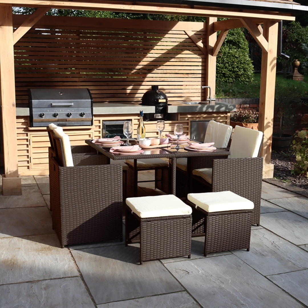 The Cannes 8 Seater Rattan Cube Set – Brown is great for everyone who likes space saving designs. Made from the highest quality polyethylene wicker around a rigid aluminium frame and tempered glass table top, it is durable and weather resistant for use all year round. Its cubic design allows it to store away compactly making it very low maintenance. The Cube Set brings warmth from inside to outdoors making it usable all year round. From an afternoon in the sun to evening drinks, this set is perfect for those who enjoy being outdoors throughout the seasons. The RC Cannes 8 Seater Rattan Cube Set – Brown is home delivered for ultimate convenience, removing the hassle of going out to a garden furniture centre. Our fast and free* delivery service ensures your furniture is delivered as fast as possible.