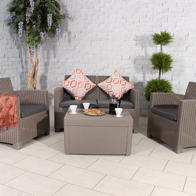 The RC Faro 4 Seater Plastic Conversation Set With Storage – Grey is the perfect piece for entertaining friends and family in the sunshine. This modern, maintenance free, hard-wearing polypropylene furniture set comes complete with a 2 seater sofa bench, 2 armchairs and a coffee table with storage facility. The Lounge Set is the perfect summer purchase if you’re looking to carve out a spot to sit and relax – no matter the size of your outside space. These four seater garden furniture sets are ideal for patios and smaller gardens, patios and balconies. There are plenty of options of garden furniture sets that fold away when you don’t need them. Although polypropylene garden furniture is all weather, we still recommend to cover your furniture and store your cushions inside so that you can protect them from the elements. The RC Faro 4 Seater Plastic Conversation Set With Storage – Grey is home delivered for ultimate convenience, removing the hassle of going out to a garden furniture centre. Our fast and free* delivery service ensures your furniture is delivered as fast as possible.