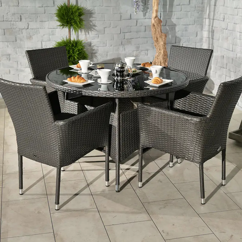 The RC Malaga 4 Seater Rattan Stacking Round Dining Set is a budget-friendly range. It is hand-woven onto sturdy steel frames and made from a grey flat synthetic rattan weave. Consisting of a table that features black inlay glass and four fixed stacking chairs complete with seat cushions. The Dining Set is the perfect summer purchase if you’re looking to carve out a spot to sit and relax – no matter the size of your outside space. These four-seater garden furniture sets are ideal for patios smaller gardens, patios and balconies and are traditionally made out of rattan, metal or wood. The RC Malaga 4 Seater Rattan Stacking Round Dining Set is home delivered for ultimate convenience, removing the hassle of going out to a garden furniture centre. Our fast and free* delivery service ensures your furniture is delivered as fast as possible.