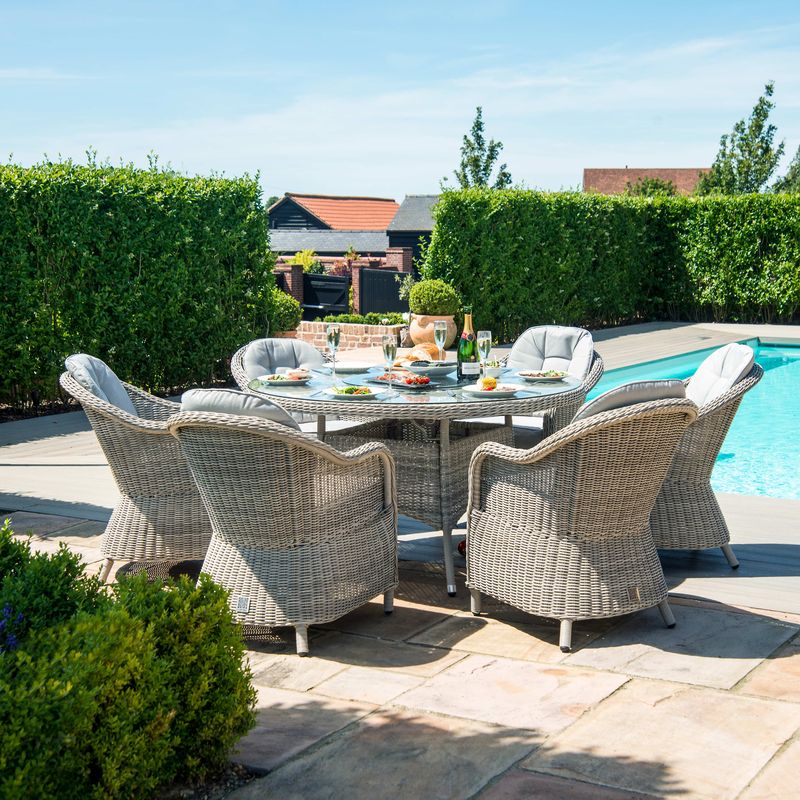 The Stratford 6 Seat Fire Pit Dining Set with Heritage Chairs brings a touch of luxury to your al fresco dining. The round table topped with toughened glass teamed with the six comfortable chairs complete with base and back cushions to make this the perfect set to share breakfast, lunch, or dinner! In addition this table has been integrated with a gas Fire Pit system which will allow you enjoy your garden furniture to the late hours in the evening along with a Lazy Susan to cover the Fire Pit when not in use. All of our Fire Pit systems are CE registered and have a BTU of 50,000 (British Thermal Unit is a unit that measures the heat generated by the burner). On average, depending on the setting used, our Fire Pits will produce approximately 6-7 hours use for a 7KG gas bottle. We recommend using a propane gas bottle, which can be stored underneath the table. Please note the ice bucket feature is not included with this product.
