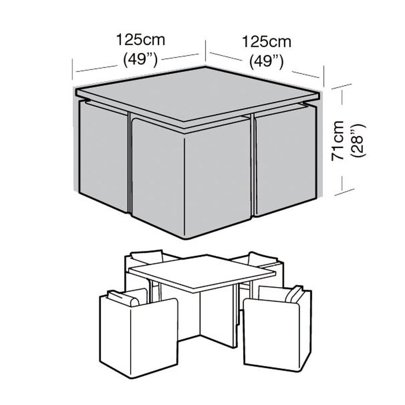 Designed to cover and protect a 4 seater medium cube set. The Super Tough 4 Seater Medium Cube Set Cover in Black is made from multi-layered cross laminated polyethylene grade material. This cover is also suitable for a Medium Square Table. The Super Tough garden furniture cover range features our unique zero fade technology, full UV protection against the sun for longer life and a wipe clean surface. The cover offers full weather protection, while also protecting your dining set from bird droppings, tree sap & pollution. All round draw string bottom with cord locks are included for added security. Important: Do not leave your cushions on your furniture when covered.