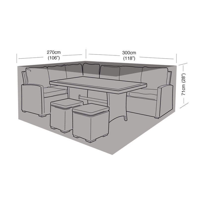 The Super Tough Large Casual Dining Set Cover in Black is made from multi-layered cross laminated polyethylene grade material. The Super Tough garden furniture cover range features our unique zero fade technology, full UV protection against the sun for longer life and a wipe clean surface. The cover offers full weather protection, while also protecting your sofa dining set from bird droppings, tree sap & pollution. All round draw string bottom with cord locks are included for added security. Important: Do not leave your cushions on your furniture when covered.