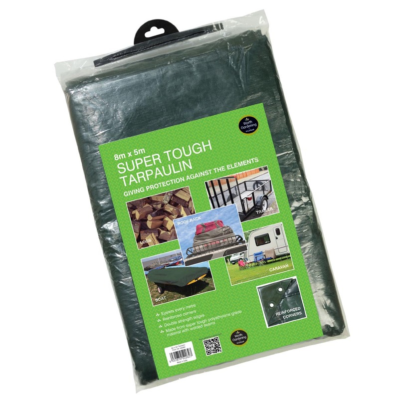 The Super Tough Tarpaulin offers protection against the elements to a number of different items. This super tough tarpaulin is made from cross laminated polyethylene grade material with welded seams and reinforced corners. The tarpaulin also features double strength edges and eyelets every metre. Great for use over logs, trailers, roof racks, boats, caravans & more. Available in 4 sizes, this version is 8m x 5m.