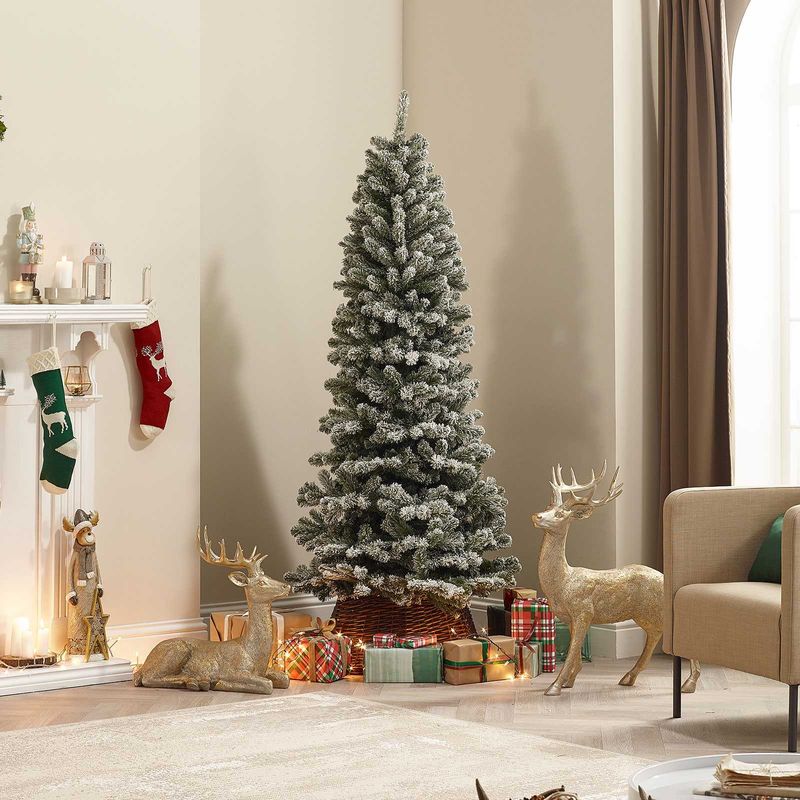Vixen Balsam Fir Slim Frosted Christmas Tree – 7ft is the perfect artificial tree for any front room, grand hallway or shopping centre display. At 7ft tall this tree is an ideal height that provides plenty of room for decorations. This tree features a 3-part hinged design which offers much easier assembly and dis-assembly over a hooked design. Simply connect the base and pole, unfold the branches and re-position them to your liking. Created using PVC bottle brush branches this tree is extremely full looking as well as being easy to shape how you see fit. The 1000 branch tips are predecorated with a flocked snowy finish and read for you to add baubles and lights to. Please do be aware that the fake snow may be toxic to your pets, so be sure to keep your furry friends away from your tree or consider a non-flocked alternative. This tree comes with a 50cm foldable metal base which will support your tree and keep it standing upright. This tree can be used indoor use only. With its great full, bushy branches, you will have plenty of room to decorate your tree our recommended decoration numbers are: 3ft tree = 60 items, 4ft tree = 90 items, 5ft tree = 120 items, 6ft tree = 160 items, 7ft tree = 200 items, 8ft tree = 300 items, 10ft tree = 400 items. This tree has experienced 45 minutes of ‘fluffing’ which we recommend to get your tree to look it’s best. Your tree will NOT look as full as this when it is first removed from the box and will require fluffing to achieve this look.